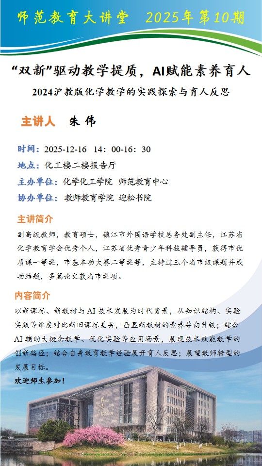 上一条:教师教育学院与镇江高等职业技术学校签订家校社协同育人“教联体”共建单位合作框架协议 下一条:【师范教育大讲堂】2025年第9期 追问:教怎样的化学?
