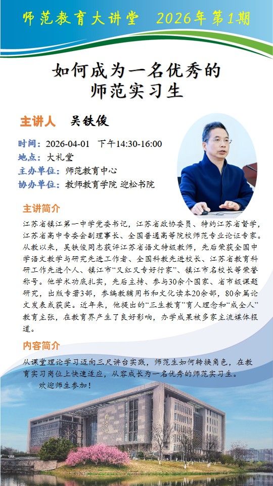 上一条:2023级本科师范生教育实习动员会举行 下一条:关于召开江苏大学2023级本科师范生教育实习动员会的通知